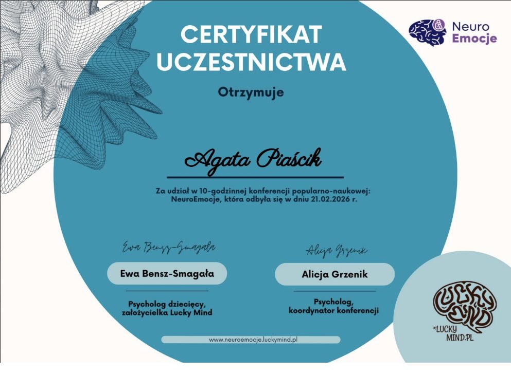 • Ukończyłam studia podyplomowe – Psychologia Dzieci i Młodzieży – Wspomaganie Rozwoju na Uniwersytecie SWPS,