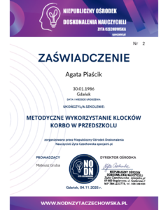 W dniu 04 listopada 2025 r. wzięłam udział w szkoleniu „KORBO Blocks”, które zakończyłam uzyskaniem certyfikatu potwierdzającego zdobycie nowych kompetencji dydaktycznych. Podczas szkolenia poznałam innowacyjne metody pracy z wykorzystaniem klocków KORBO, które rozwijają u dzieci myślenie logiczne, wyobraźnię przestrzenną, koordynację wzrokowo-ruchową oraz umiejętność współpracy w grupie. Zdobyte umiejętności pozwalają mi wykorzystywać zestawy KORBO zarówno podczas zajęć grupowych, jak i indywidualnych, wspierając wszechstronny rozwój dzieci poprzez naukę przez zabawę i eksperymentowanie.